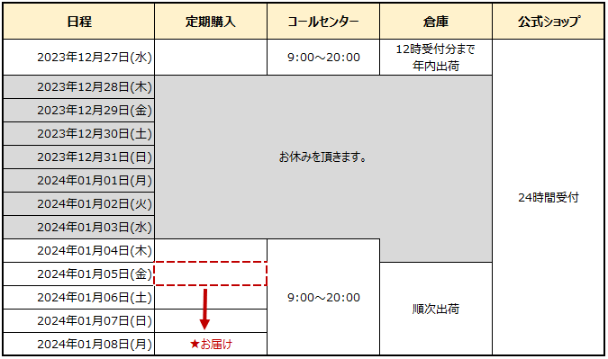 年末年始に伴い、定期購入のお届け日変更と休業についてご案内いたします。
